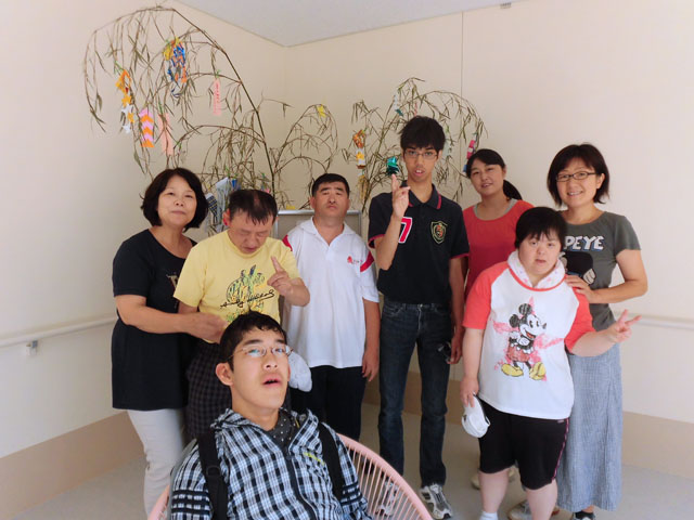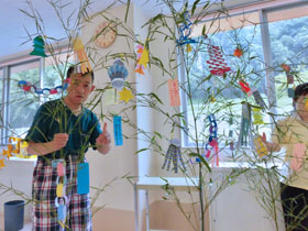 のぞみワークショップでも、七夕の飾り付けをしました。笹は裏山から人数分とってきて、みんなの願いを短冊に記し、折り紙を切って飾りました。