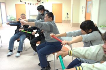 腕を伸ばすと、あちらこちらから「いて、て…」という声が聞こえます。 |
