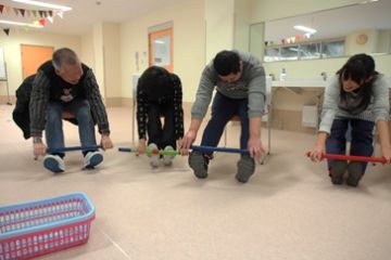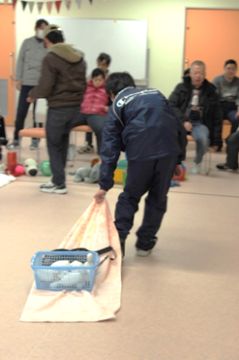 落とさないようたくさん拾って持ってくること。たくさん取れたグループの勝利です! |