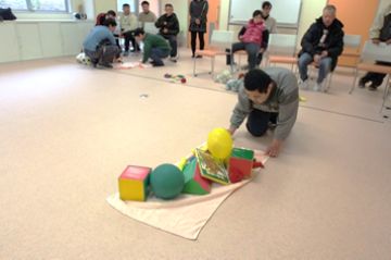 さて、次はボーリングです。倒さないように、ピンを並べる時も真剣です。 |