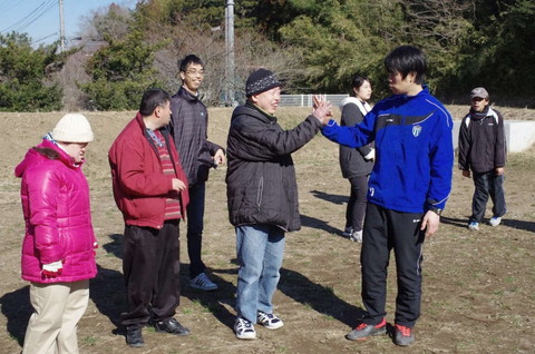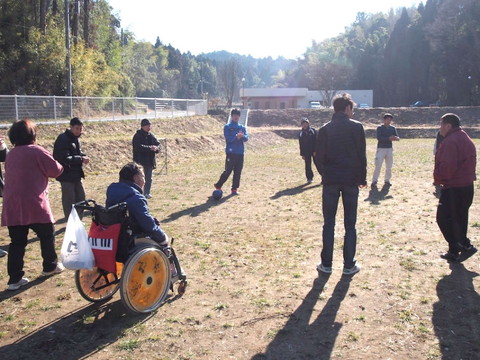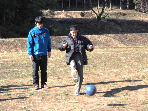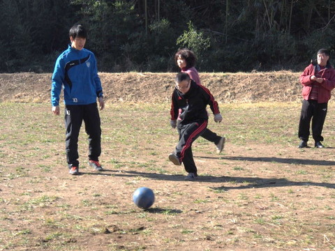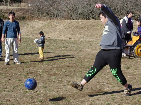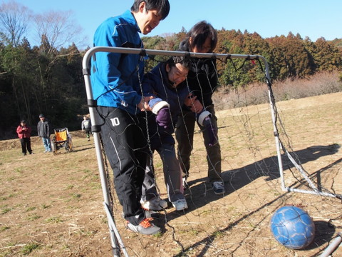 最後に、グラウンドの向こう側に向かって、思いっきり蹴ってみましょう。 満山さんがお手本を見せます。 あちら側には、足の速さに自信のある利用者たちがボール拾いに待ち構えています。それっ! |