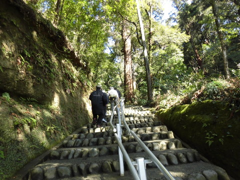 ここからは靴を脱いで、さらに急な階段を上っていくことになります。 その上には、最澄上人が刻んだという楠の十一面観音があるのですが…帰ってきたFさん、どうでしたか? |