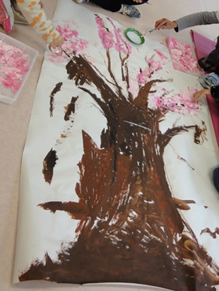 最後は、ちぎった紙を使用して桜の花びらを木に咲かせます。 |