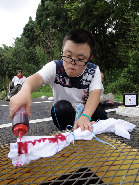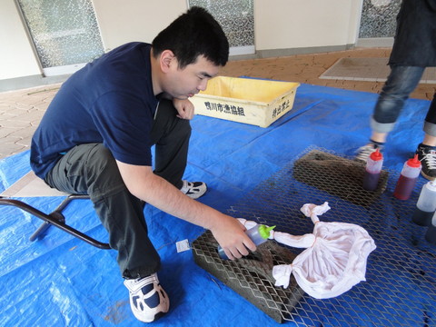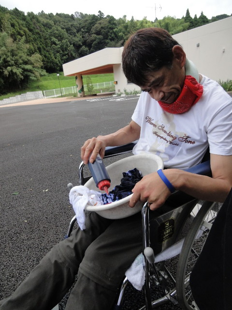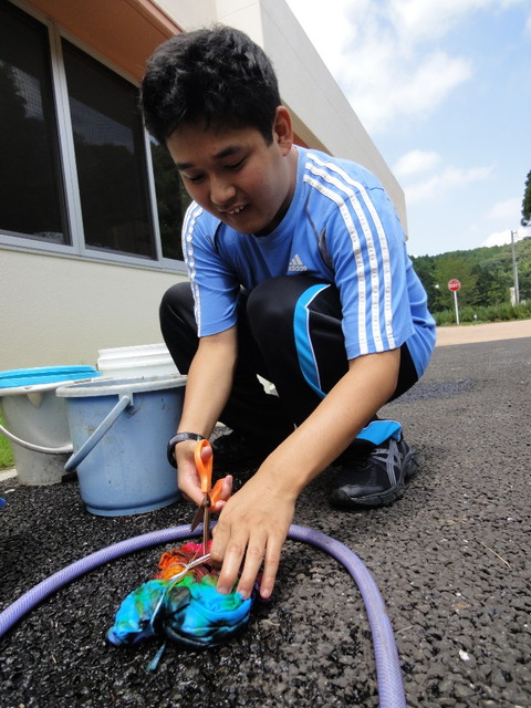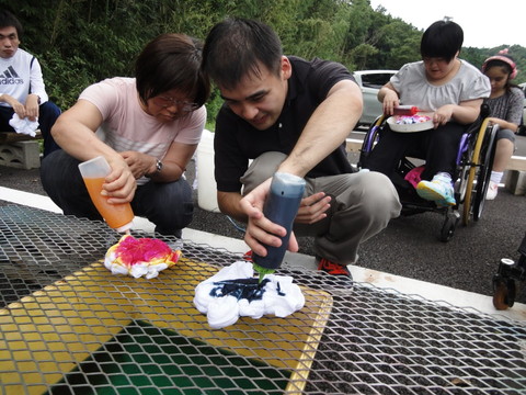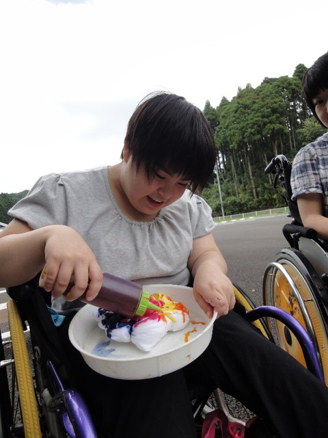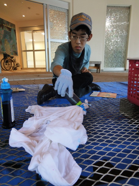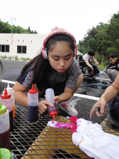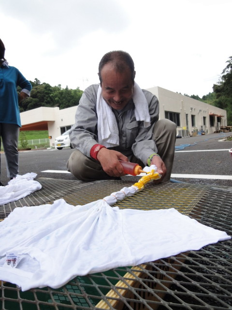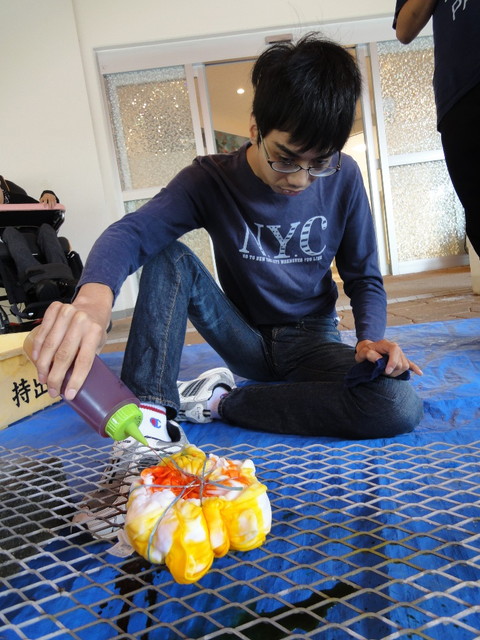そして、次は染色です。絞って小さくなったTシャツに思い思いの色の染色液をかけていきます。