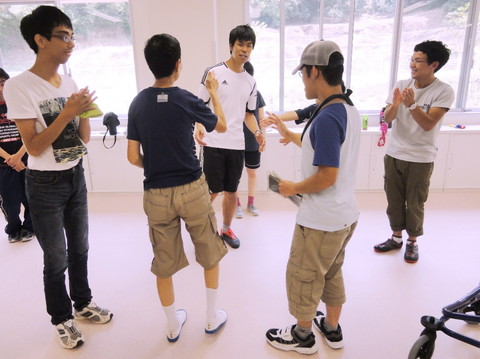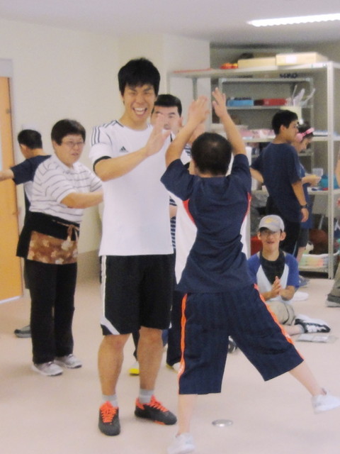 終わったとたんに、熱狂した利用者の方たちがわれさきにと、満山さんに握手を求めます。今日も楽しかったね!! |