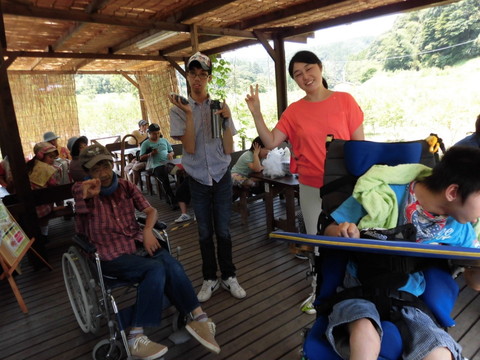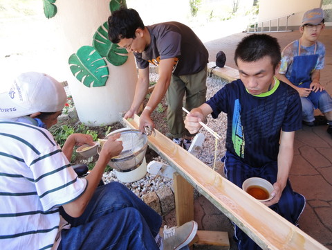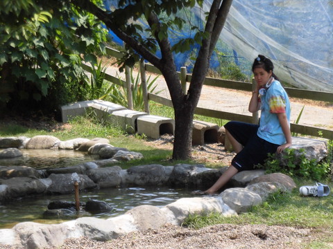 山からの湧水をひいた池(これも手作り)もあり、足を冷やして涼をとっている姿もありました。気持ちよかったね! |