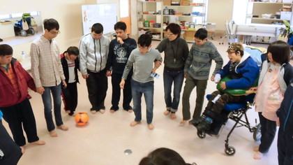 裸足でボールの感触を確かめながらの、100回パス。ボールを追う目も真剣です。