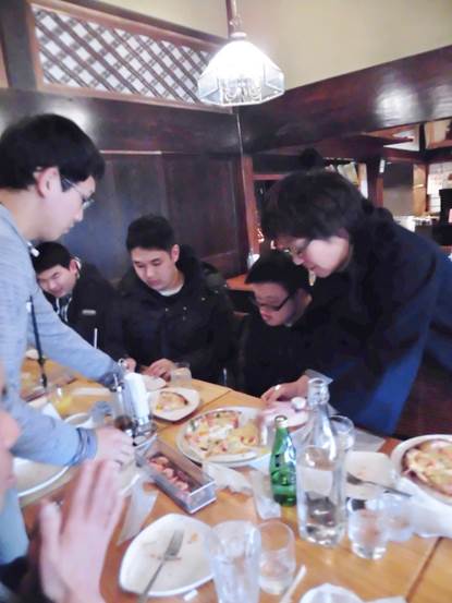 「どんどん取り分けるから、みんな食べてね!」 一切れずつ、5種類ものピザをいただきますので、スタッフは大忙し!