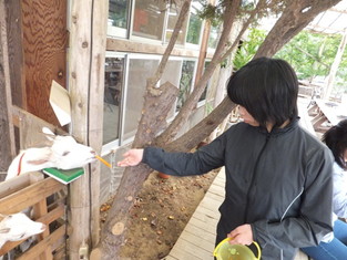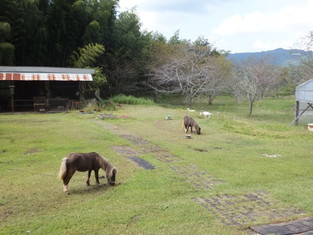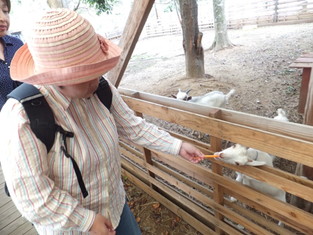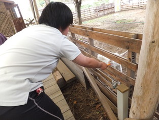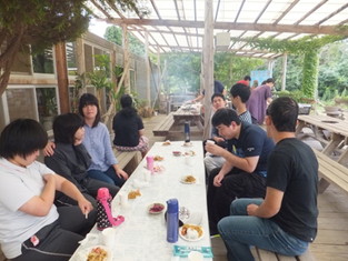 オープンテラスでバーベキューを楽しみました。本格的な炭火焼肉! 食事の後は動物たちとのふれあい。最初は怖がっていた人も、人懐っこい動物たちと いつのまにか仲良しに。