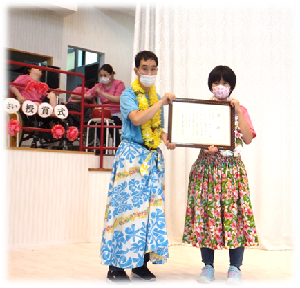 今回、のぞみワークショップでは、8月に開催された、“オンラインやっさいもっさい”に参加いたしました! 利用者さんの毎日の練習のかいもあり、なんと…≪特別賞≫を頂くことが出来ました♪ そして、衣装を貸して頂いた保護者の方にも感謝の気持ちでいっぱいです!ありがとうございました ♥ これからも様々なことに挑戦していこうと思います! 特別賞 授賞式 2020年9月18日の様子です♪ また、理事長からも≪理事長賞≫を頂き、皆さん喜んでいました! 理事長からは、キラキラのメダルと美味しいお菓子を頂きました ♥